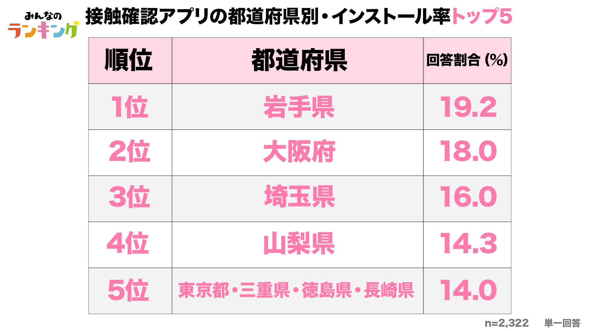 - 都道府県別|接触確認アプリ認知度ランキングトップ5