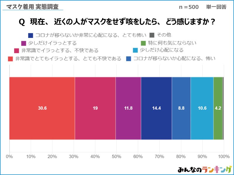 1位となったのは153人が答えた「非常識でとてもイラっとする、とても不快である」(30.6%)で、2位は「コロナが移らないか非常に心配になる、とても怖い」(14.4%)。"とても""非常に"という程度が高い言葉を含んだ回答が上位に入りました。