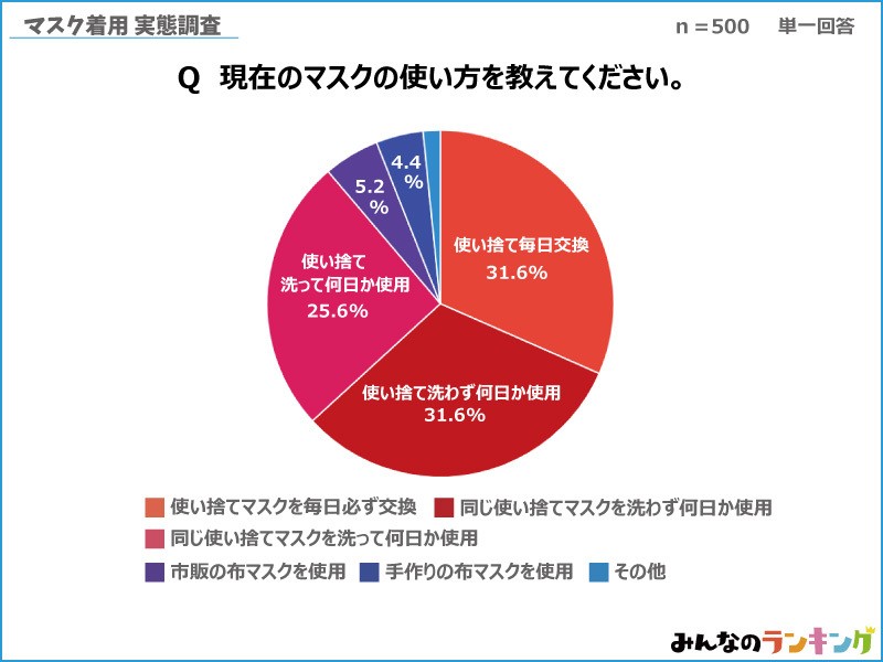 やはり主流は不織布などでつくられる使い捨てマスクとなっており、「必ず毎日交換する」と「洗わず何日か着用して交換する」が同率で1位という結果になりました。3位の「洗って何日か着用してから交換する」を足すと、使い捨てマスクを使う人が全体の約9割に。