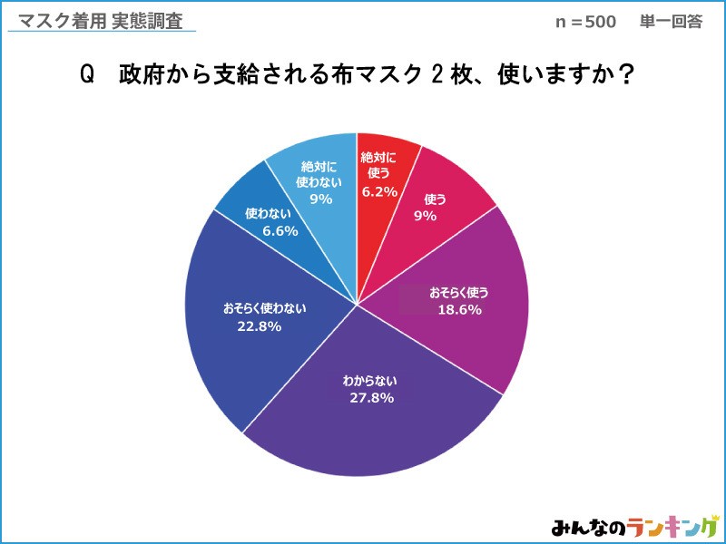 アンケート調査を実施した4月20日前後の段階では、まだまだ布マスクが各家庭に行き渡っていないこともあり、「使うかわからない」が全体の27.8%で最も多い結果に。 以下、「おそらく使わない」(22.8%)、「おそらく使う」(18.6%)と続きます。