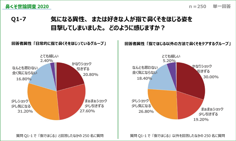 今回、回答者のグループを2つにわけて調査を実施したのには理由があります。日常的に指で鼻をほじっている人は、好きな人がほじっていても「気にならない」と回答する割合が増えるのではないか、と考えたためです。そして、逆に自分が指でほじっていない場合、「ショック」の割合が増えるのではないかという仮説も立て、調査してみました。