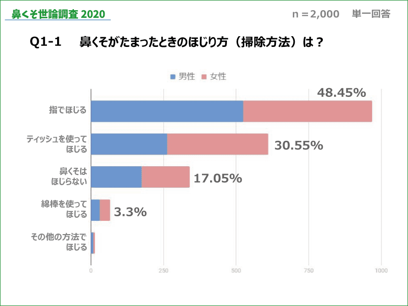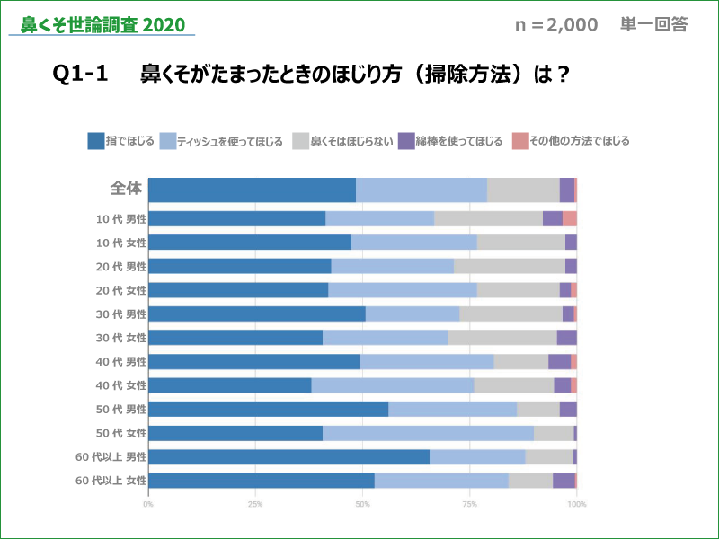 年齢や性別で回答に目立った差はなく、「指で鼻をほじること」は、鼻の穴の掃除において最もスタンダードな手法であることが明らかになりました。