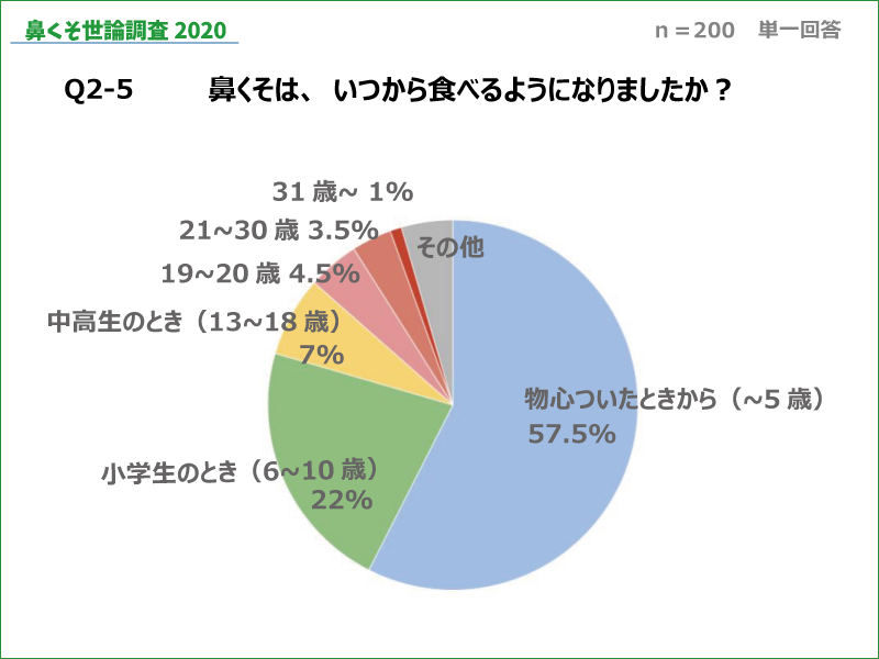 1位が「物心ついたときから(~5歳)」(57.5%)、2位が「小学生のとき(6~12歳)」(22%)という結果に。鼻くそを食べていた幼少期の癖が抜けず、現在も口にしてしまう人が多いようです。