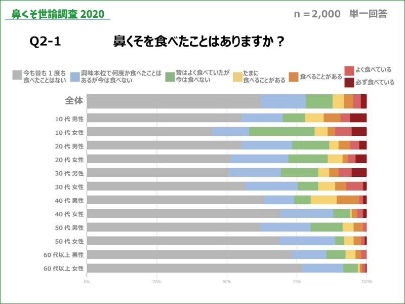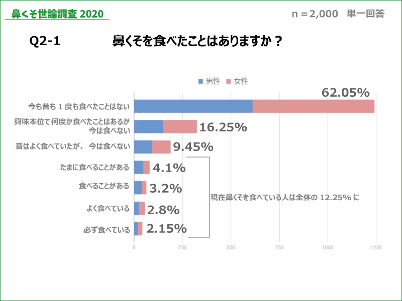 そこで、男女2000人(男性1000人・女性1000人)に対し「鼻くそを食べたことがありますか?」という質問をしてみました。