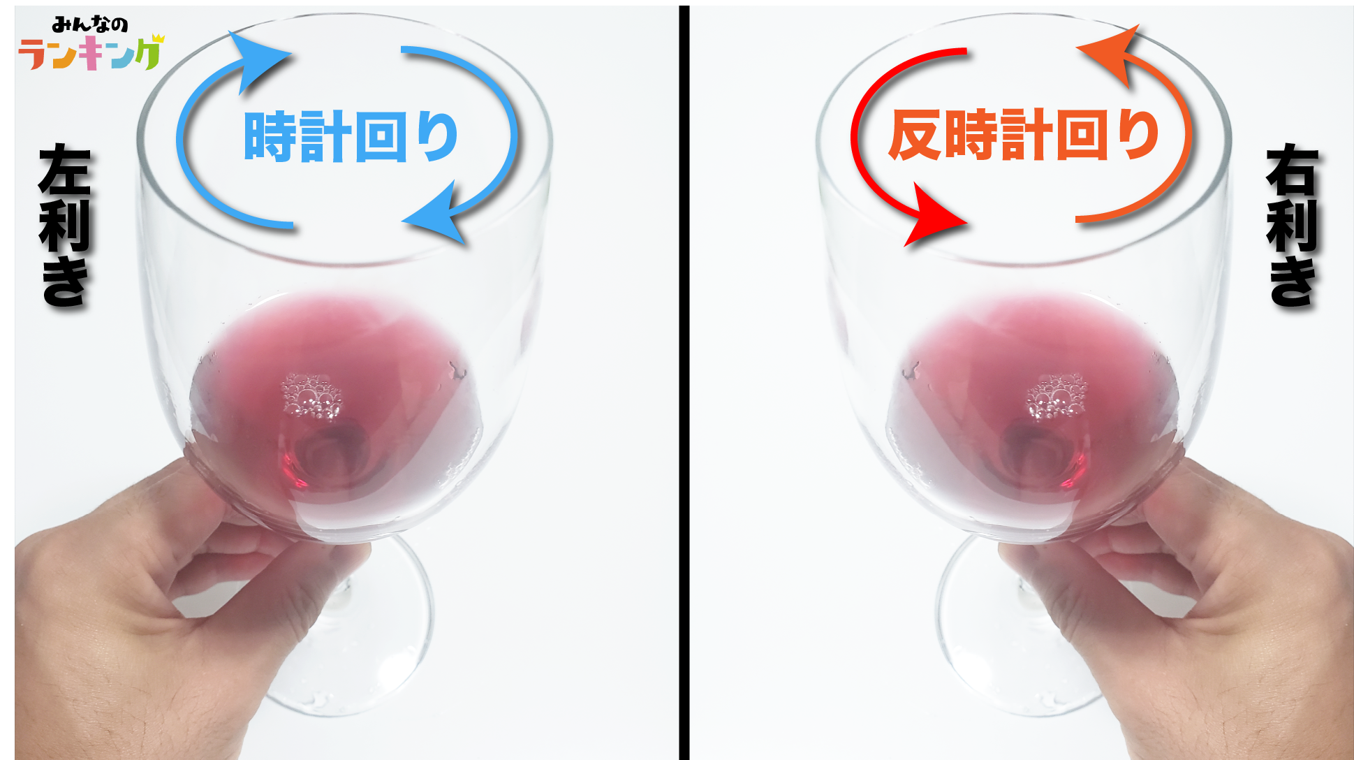 スワリングのやり方としては、テーブルの上に置いたグラスの足を持ってくるくると2~3回程度回します。もしグラスからワインがこぼれても自分にかかるように、右利きなら反時計回り、左利きなら時計回りで行いましょう。