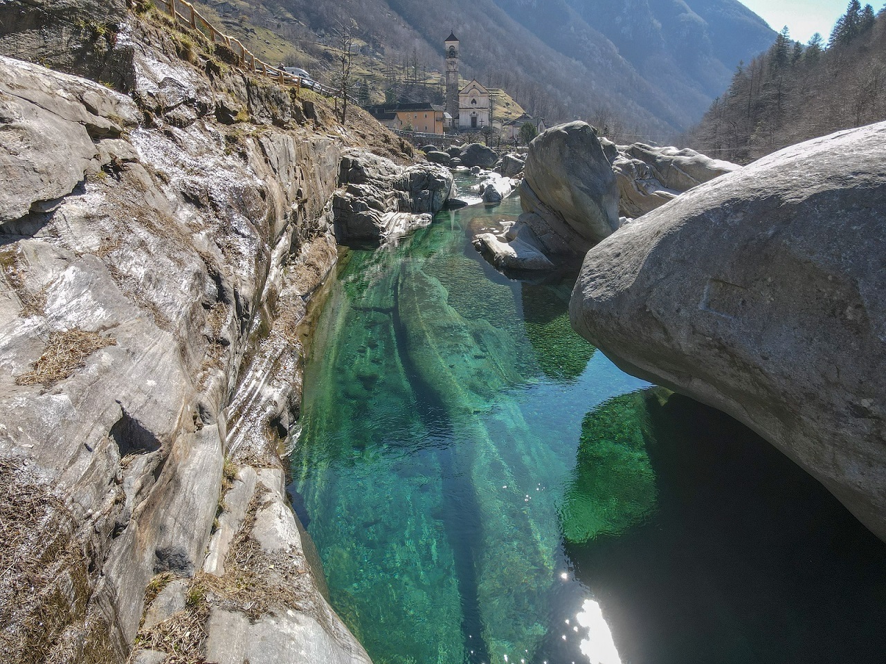 どちらも場所により10m前後の水深がありますが、地上から川底が目視できるほど水が澄み切っています(上の写真はヴェルツァスカ川)。