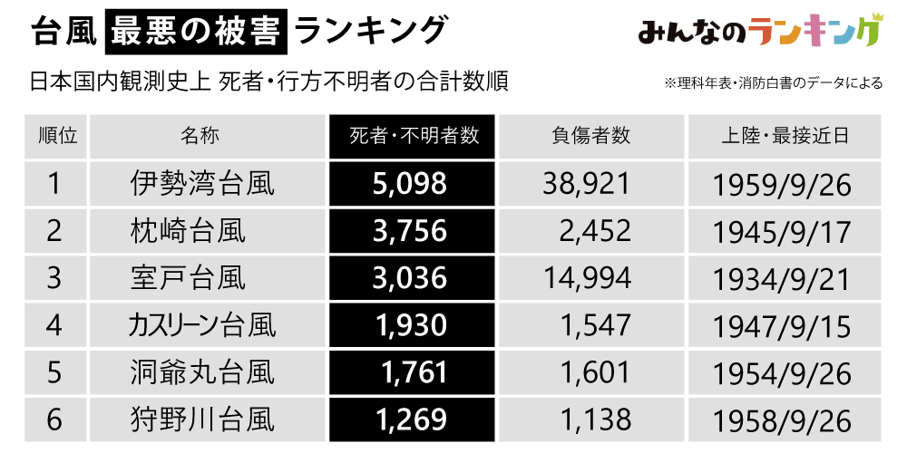 - 【死傷者・行方不明者・全壊・ 床下浸水など】日本に大きな被害を与えた台風一覧