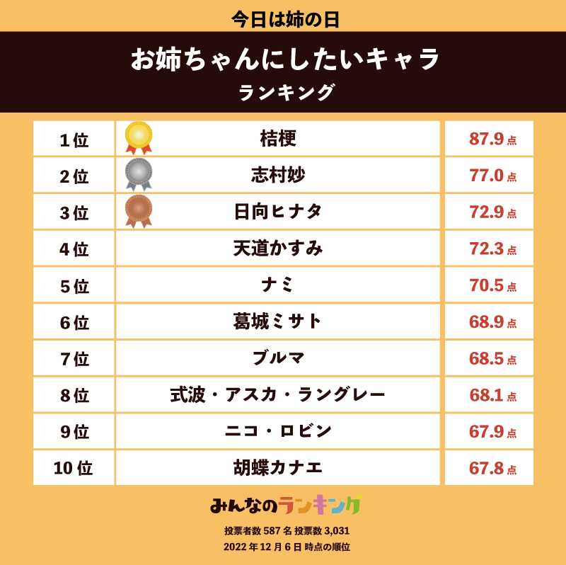 今日は‘‘お姉ちゃんになってほしいキャラクター’’と称して「姉キャラランキング」を紹介。