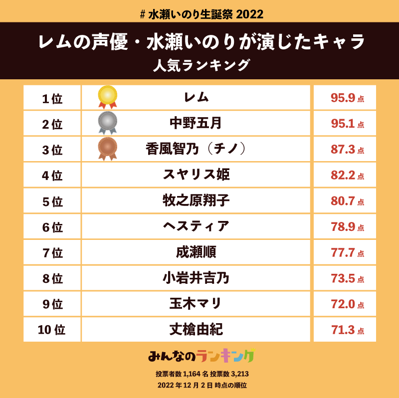 明るい性格のかわいいキャラからクールで透明感溢れるキャラまで、少女役を中心に演じてきた水瀬さん。みんなのランキングで行った気になる投票結果はこちら!
