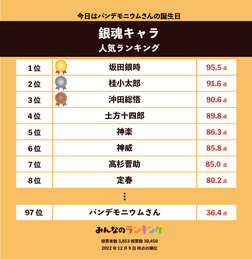 今日はそんなパンデモニウムさんの羽化日を記念して「銀魂キャラ人気ランキング」を紹介。