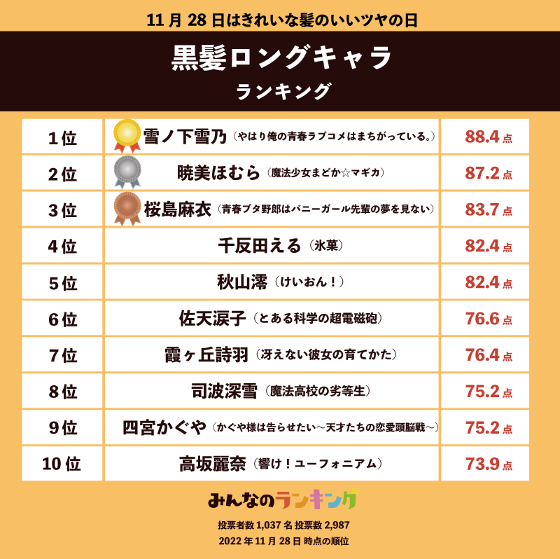きれいな髪のいいツヤの日ということで、今回は「黒髪ロングキャラランキング」をご紹介。