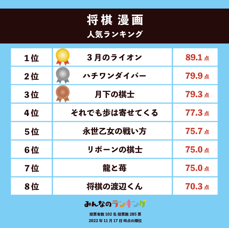 さて、「将棋の日」ということで、みんなのランキングで投票を募集している「将棋漫画ランキング」の結果を紹介します。