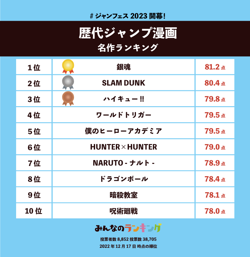 そこで今回は、ジャンフェス2023の開催を記念して「歴代ジャンプ漫画名作ランキング」を紹介。