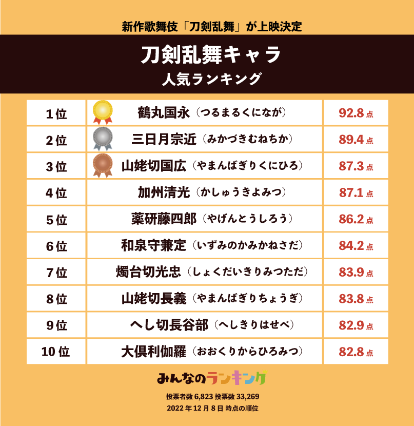 【新作歌舞伎「刀剣乱舞」上映決定】とうらぶキャラ人気ランキング