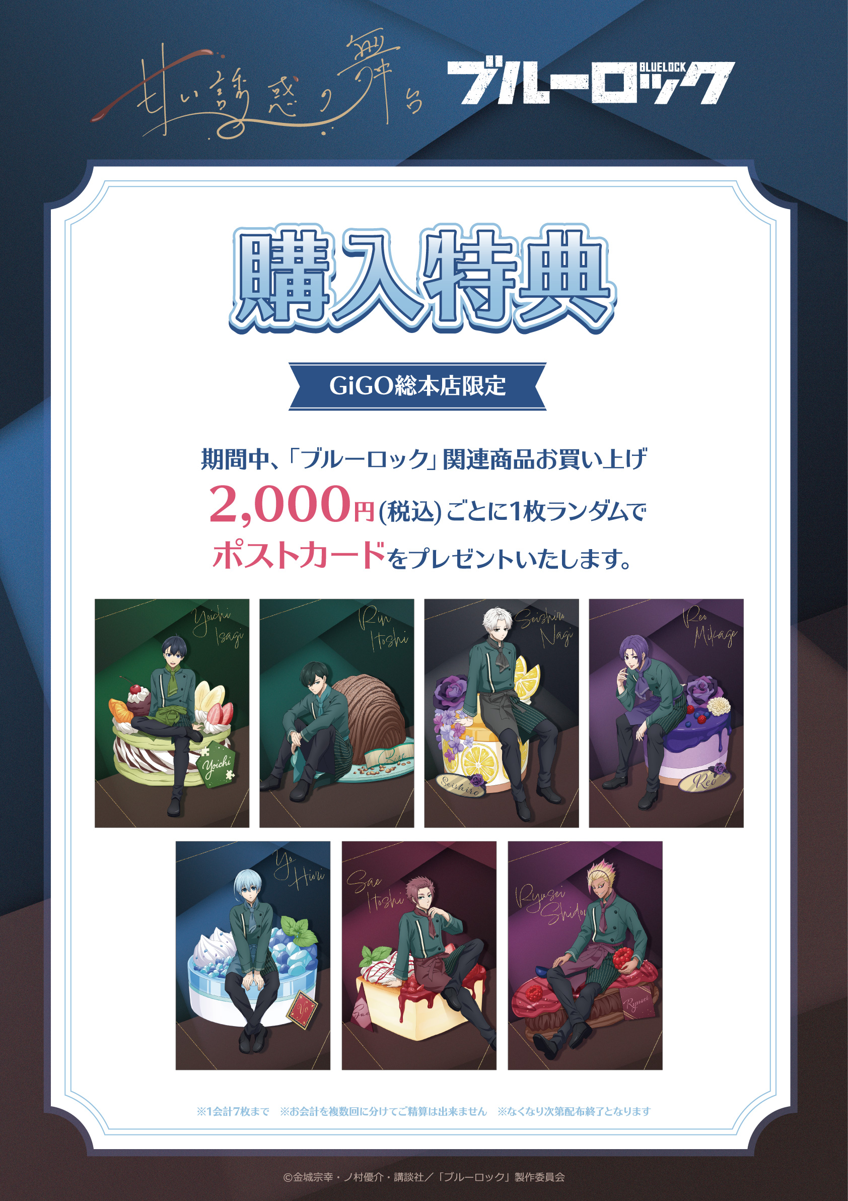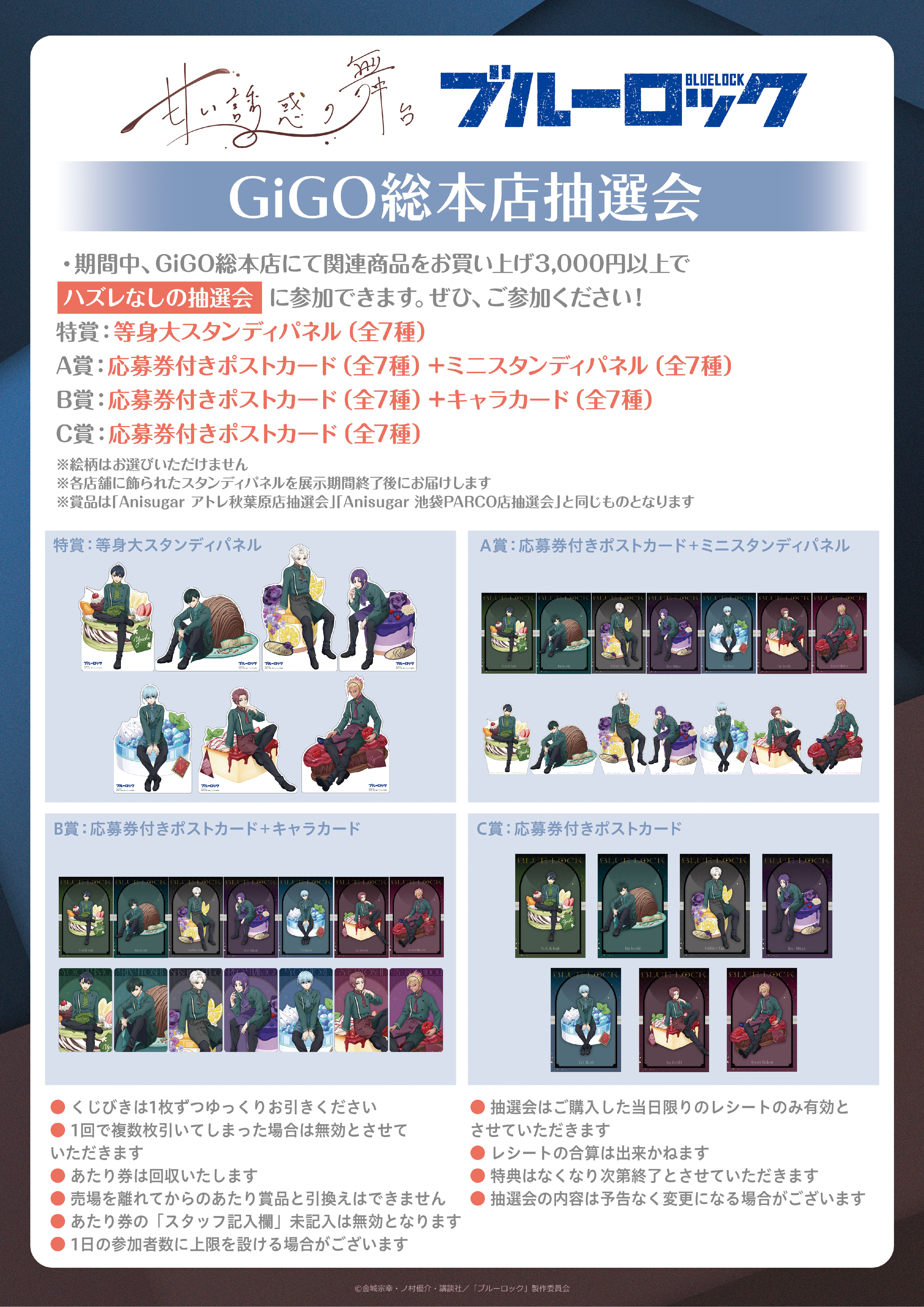 GiGO総本店では、ブルーロックの世界観を存分に楽しめるポップアップイベントを開催。3,000円以上の商品購入でハズレなしの抽選会に参加可能で、2,000円ごとに特製ポストカードがランダムで1枚がもらえます。(全7種)また、「ゆらりアクリル<甘い誘惑の舞台>」(1,100円)など、限定グッズも販売されます。