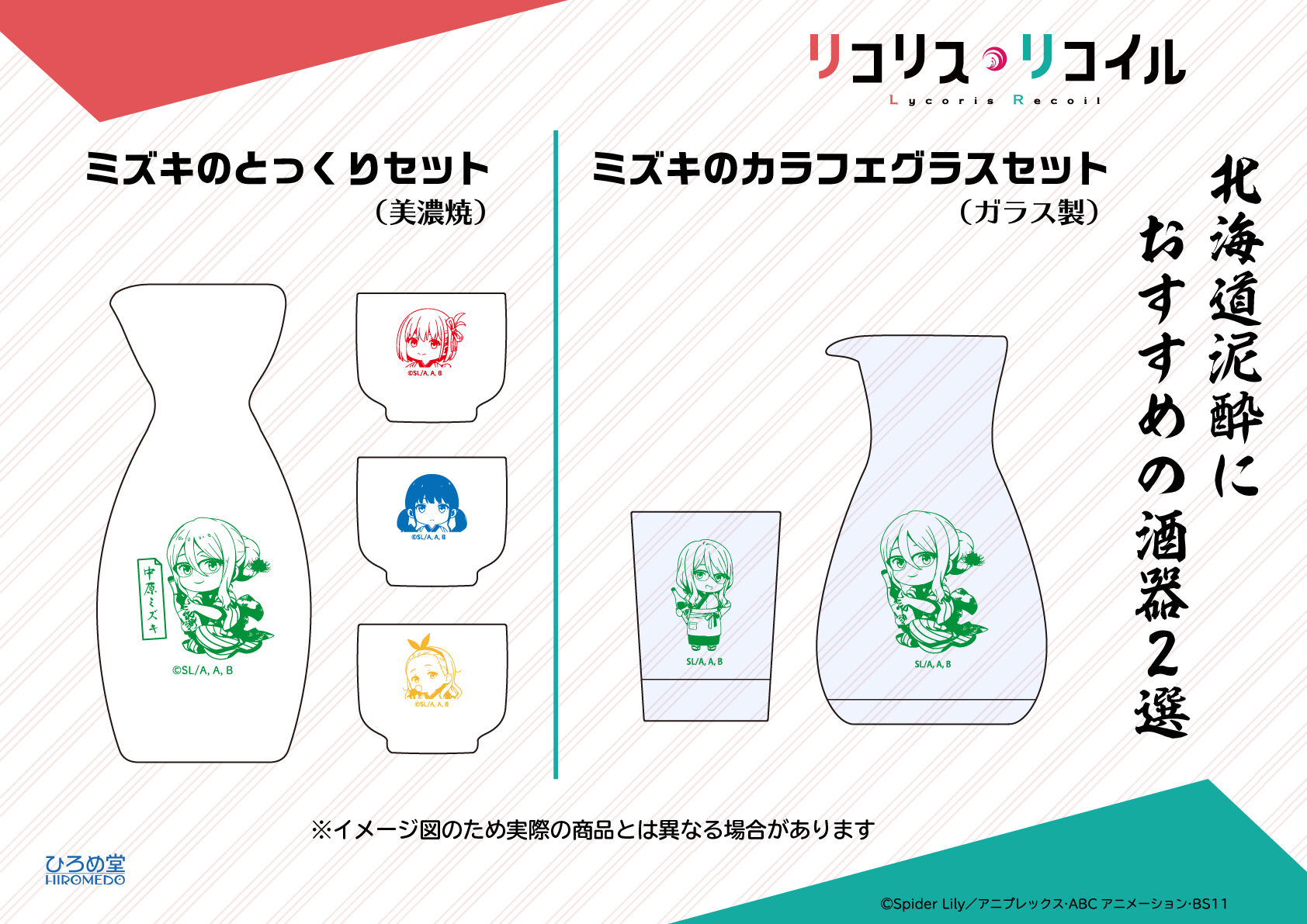 今回の再登場にあわせて、デフォルメイラストを施した酒器2種類が発売されます。「ミズキのとっくりセット」は美濃焼で、ミズキのとっくりと千束、たきな、クルミのおちょこのセットです。一方、「カラフェグラスセット」は、1人飲みに最適なカラフェとミズキが描かれたグラスがセットになっています。