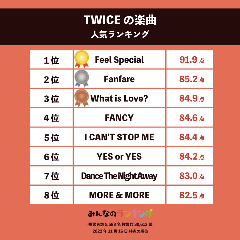 現在までに合計180曲以上を発表してきたTWICE。紅白ではどの曲を披露するのか期待の声も集まっている。みんなのランキングで行った人気投票の結果はこちら。