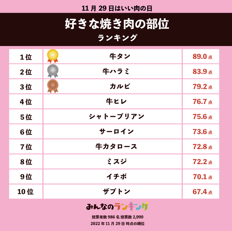 【今日はいい肉の日】好きな焼き肉の部位ランキング