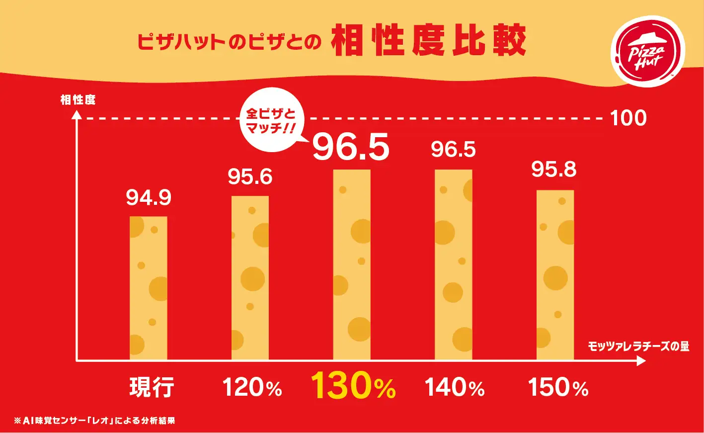 ピザハットは、最新のAI味覚センサー「レオ」を活用し、味を数値化・チャート化。これに職人たちの長年の経験を組み合わせることで、モッツァレラチーズを130%に増量するという最適解にたどり着きました。10月21日からは全商品にこの黄金比を採用しています。