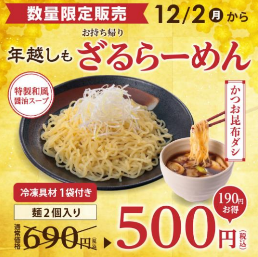 - テイクアウト特価: お持ち帰り用ざるらーめんを500円の特別価格で提供