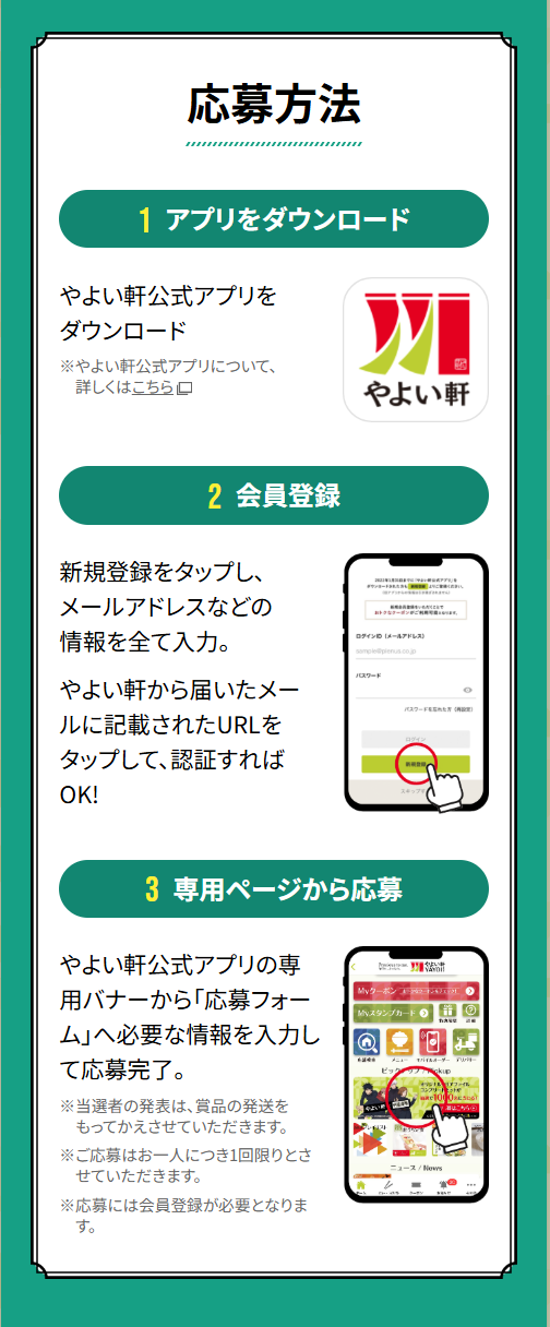 - アプリ企画:やよい軒公式アプリをダウンロードし、会員登録後に専用ページから応募