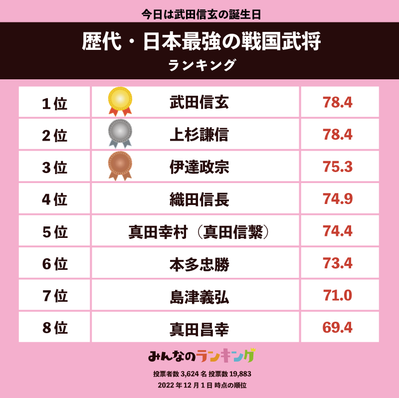 【今日は武田信玄の誕生日】歴代・日本最強の戦国武将ランキング