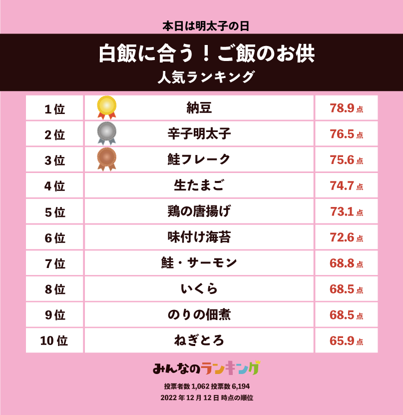 今日はそんな長きに渡って愛される明太子もランクインした「ご飯のお供人気ランキング」を紹介。