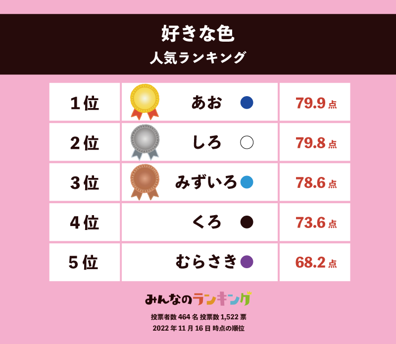 いい色ということで、みんなのランキングで投票を受け付けている「好きな色ランキング」の結果をご紹介します。