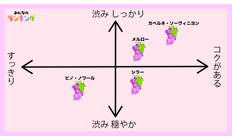 上記で紹介したボディのほかに、使われているブドウの品種によっても赤ワインの味わいは変わります。赤ワインのブドウ品種では最もポピュラーなのが、フランスのボルドー地方を原産とする「カベルネ・ソーヴィニヨン」。黒ブドウの王様と呼ばれ、コク深い味わいが特徴です。ほかにも、渋味が少なめで甘みがある「メルロー」、酸味が強くスパイシーな香りの「シラー(シラーズ)」、気候やつくり手による味わいが顕著に変化することから上級者に人気の「ピノ・ノワール」というように、さまざまな品種のブドウが栽培されています。ワインは使われているブドウの味が色濃く反映されるお酒のため、それぞれの品種の特徴に注目することがワイン選びの近道です。