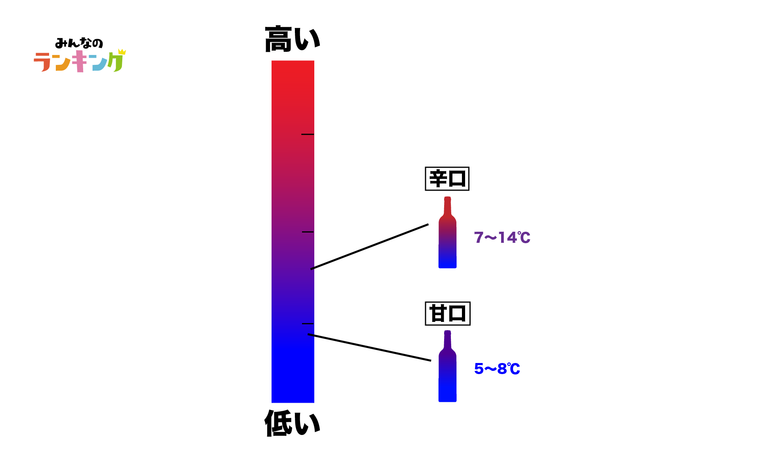 ブドウの発酵にともなって糖度が低くなった状態の白ワイン。酸味が強いシャープな味わいのため、より食事とも合わせやすいです。辛口では7~14℃くらいが飲み頃とされています。